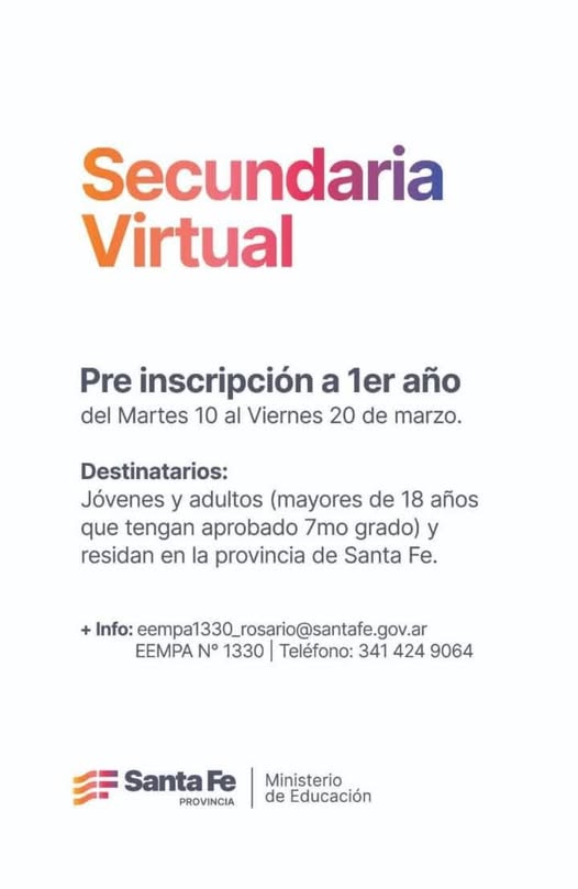 El Gobierno de la Provincia de Santa Fe informa que se encuentra abierta la preinscripción para la modalidad de Secundaria Virtual, una iniciativa educativa diseñada para que jóvenes y adultos puedan retomar y finalizar sus estudios medios. El periodo para anotarse se extiende hasta el próximo 20 de marzo.