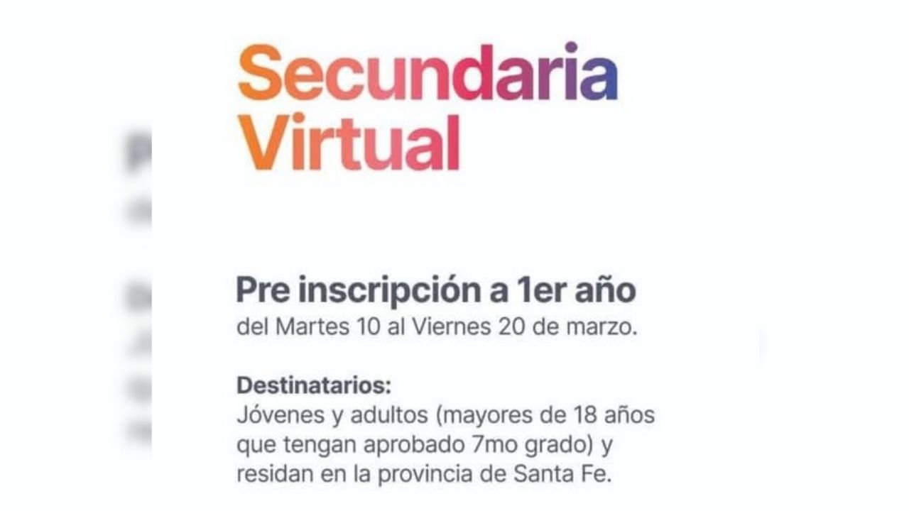 El Gobierno de la Provincia de Santa Fe informa que se encuentra abierta la preinscripción para la modalidad de Secundaria Virtual, una iniciativa educativa diseñada para que jóvenes y adultos puedan retomar y finalizar sus estudios medios. El periodo para anotarse se extiende hasta el próximo 20 de marzo.